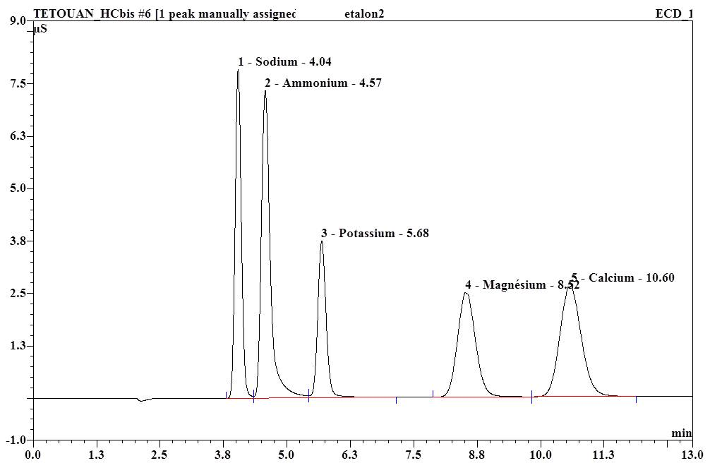 | DIONEX AQUION +Sample charger ASAP (Chromeleon 7.2.10ES) | Cations : Na+, NH4+, K+, Mg2+, Ca2+ | Ionic Exchange CG12A + CS12A (14 mn) | Self-suppression DIONEX CERS 500 | Isocratic mode 20 mM CH3SO3H (MSA) (1 mL/mn) |