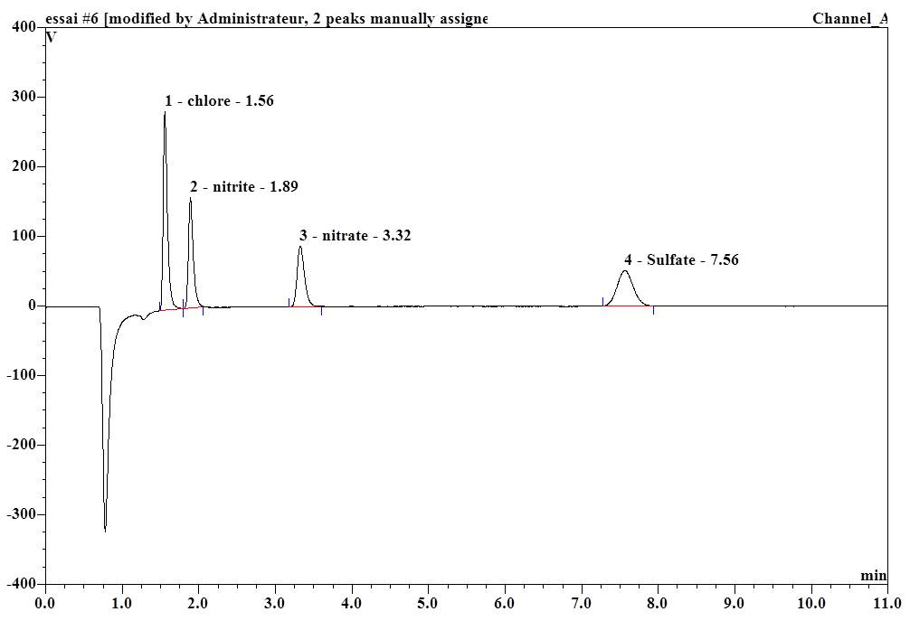 | DIONEX INUVION +Sample charger ASDV (Chromeleon 7.3.2) | Anions : F–, Cl–, NO2–, NO3–, SO42-, PO43- | Ionic Exchange AG4A-SC + AS4A-SC (9 mn) | Self-suppression DIONEX ADRS 600 | Isocratic mode (1.8 mM Na2CO3/1.7 mM NaHCO3) (2 mL/mn) |